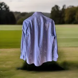 This blue shirt has an argyle/diamond pattern and a button closure with accents that add a touch of class. The shirt length is 30 inches, and the neck size is 15.5 inches. It's machine washable with a medium fabric wash, and the shirt is available in a size M.