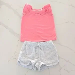 Adorable pink top with ruffle sleeves paired with white eyelet shorts. Perfect for a cute and casual look.