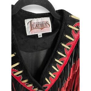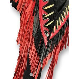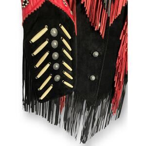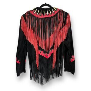 Vintage 90s Diamond Leathers Black Red Suede Fringe Western Jacket Bone Bead 12