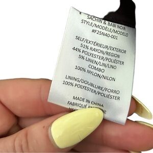 Fabric: 51% Rayon, 44% Polyester, 5% Linen; Lining 100% Polyester; Combo 100% Nylon
