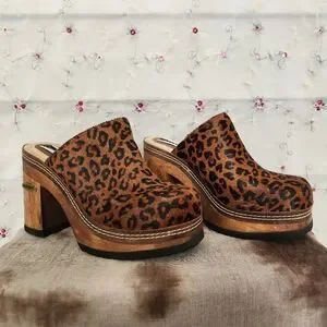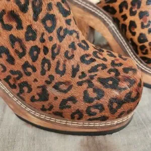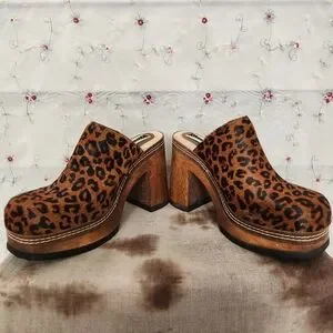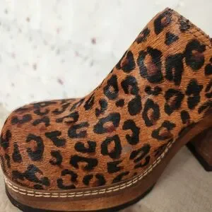 incredible authentic 90s does 70s chunky platform 100% leather slip on Mules with cheetah print cow hide hair. 9/10 condition, look new and unused (pass stress test), the hair has a couple spots (pictured) I was thinking could be colored in with like a marker or something to blend in better.
