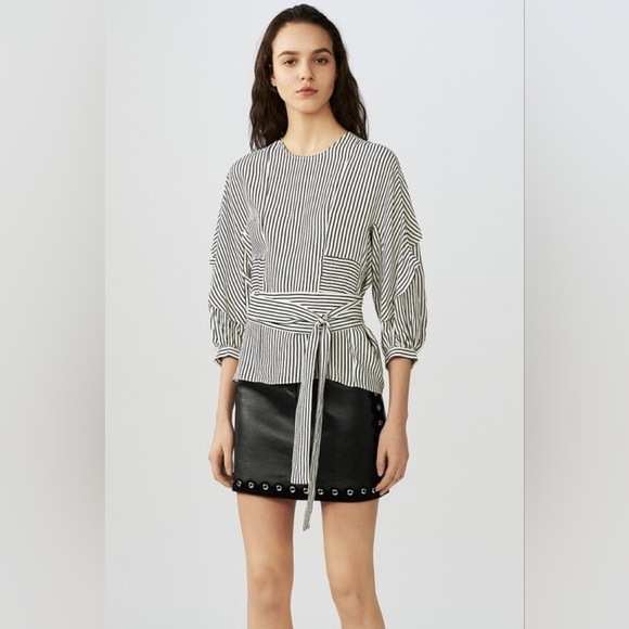 Maje Loxy Stripe Blouse Tie Waist Smocked Sides Ruffle Size 1/S