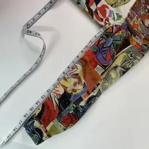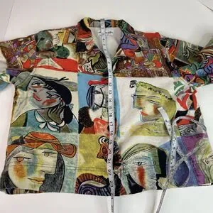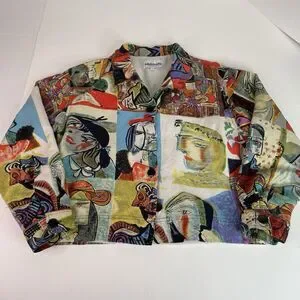 The blazer is designed with a graphic print of Picasso's famous faces, making it a true work of art. It comes in a size large, with a regular fit and size type. This blazer is perfect for parties, cocktails, or casual wear. Hand wash only for best results. Get ready to turn heads with this classic and retro piece!