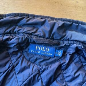 Iconic Ralph Laruren style. Classy vest in a rich navy blue. Calf leather accents. Polyester insulation.