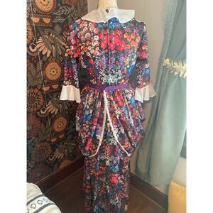 Vintage 70s Handmade Floral Long Ruffled 3/4 sleeve Dress w/ bustle