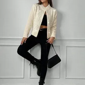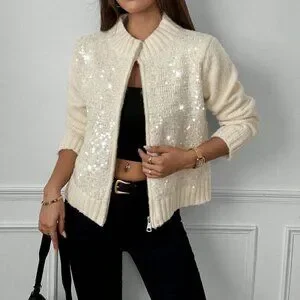 Apricot Casual Women's Fashion Sequin Knit Zip-Up Cardigan