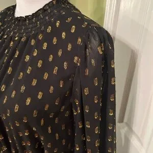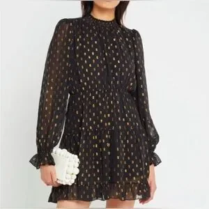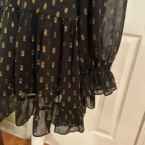 Super fun statement dress with all over gold metallic dot print, sheer long sleeves, ruffle details