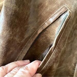 Excellent preowned vintage condition. No flaws. Vintage Newport Leather moto jacket. Lightly distressed. 2 zippered pockets on sides. Zips up. Belted bottom. Snap button on arms. Neutral light brown tan camel color. Very lightweight. More of a stiffer lighter weight real leather and has natural distressing which adds to the beauty of this. More of a matte type of leather. Fully lined interior. Vintage sizes tend to run smaller, so check measurements below. Very beautiful!