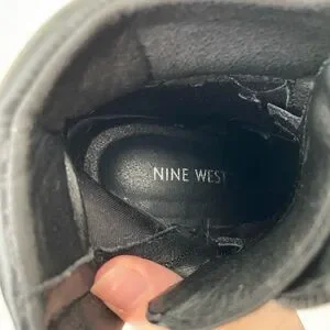 Women’s Nine West combat boots. Boots are black faux leather material with lace up front & inner zip shut style. Heel is a chunky wedge style. In like new condition—only has a mark on sole of shoe from being tried on. Size 6. Smoke free home!
