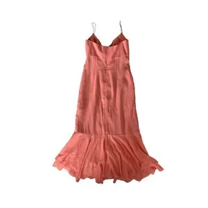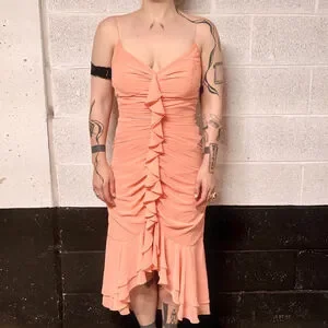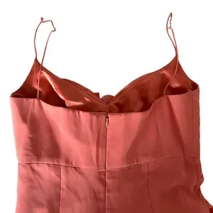 Ethereal peach formal dress, a very romantic style! Flowing high-low layered fish tail style bottom, has a lovely swish for dancing the night away. Zip back entry and silk non-adjustable straps. The perfect amount of drama for a night out or formal event.