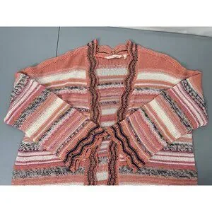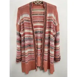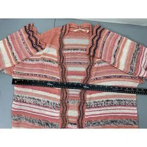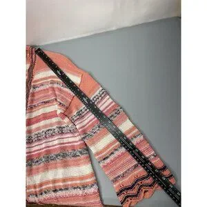 Soft Surroundings Cardigan Sweater Open Front Tunic Open Knit Metallic Threads Colorful Stripes Coral Pink Womens L