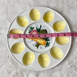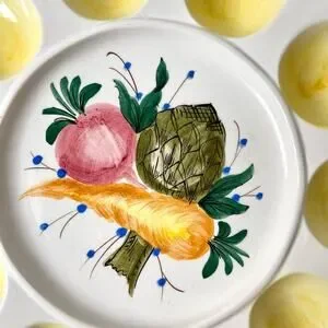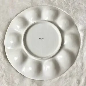 Super cute egg plate in white and pale yellow with a hand painted design of a carrot, artichoke and beet. It’s in very good condition. Says Italy on the back. Measurements are included in photos.