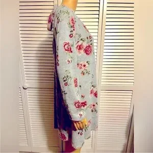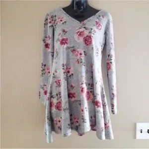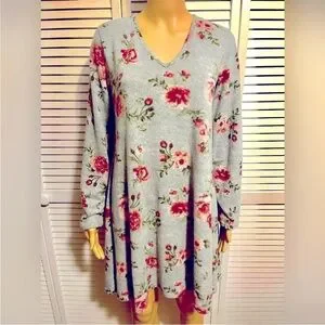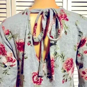 NEW WITHOUT TAGS! Alya gray and pink long sleeve floral cozy soft A line dress from Francesca’s boutique with back tie. Super cute and has an open back. Size small. Measurements in photo.