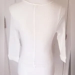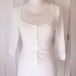 Incredibly soft button front scoop neck tee with 3/4 length sleeves.