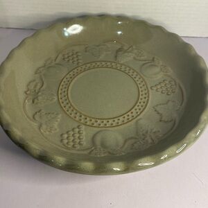 Vintage stoneware pie plate fruit design with glaze