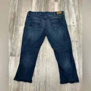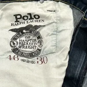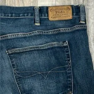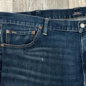 Polo Hampton relaxed straight fit jeans. Dark blue wash. Zip and button closure. 5 pocket. Belt loops. Very slight distressing. Size 46”x30”.