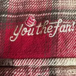 This flannel is in excellent condition and a size large on the Orvis tag. It is a heavier material good for a light jacket or those impending winter days it is a full button up with embroidery saying “you the fan”