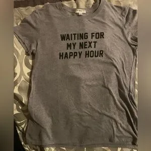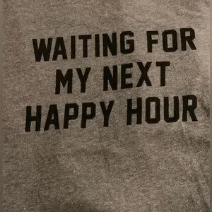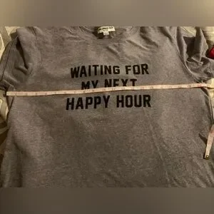 Happy Hour! Graphic Tee XL with good stretch , gray with black text, cap sleeves, longer length 28” from shoulder to bottom but stretchy!