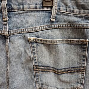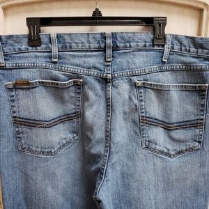 these slightly worn jeans are from the M2 Ariat line they are a relaxed bootcut style cotton spandex blend no holes stains rips or smells measurements are waist 19" length 43" inseam 30" rise 12.5" measurements taken with garment laying flat mach wash