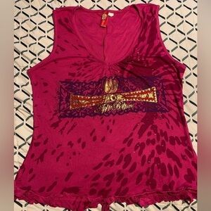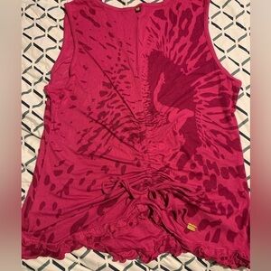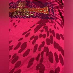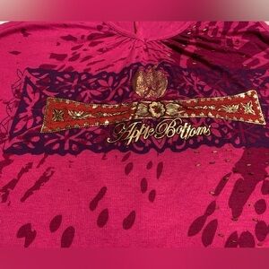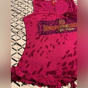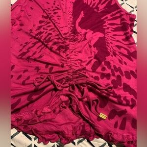 This top just has so much fun detail! It’s plus size first of all! 3X, the fabric is very stretchy and airy. The front displays a leopard style print with the apple bottoms logo with gold beads individually sewn on, the hem is ruffled all around , a V neckline. The back of the tank features a drawstring in the bottom middle that shortens the length the tighter you pull it and you can tie it in a bow, the ends of the string are gold capped and have Apple Bottoms scripted on them. P2P 22” unstretched, length 28”
