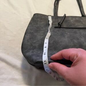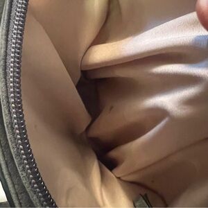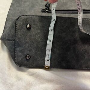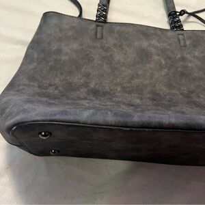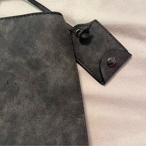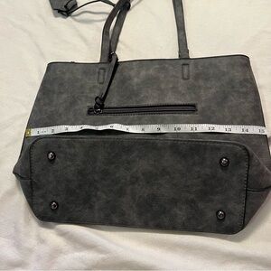 Large bag. In good condition. Middle clasp with a zipper inside. Dark gray like black color. With X medals on handles.