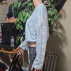 Light blue and white sky tye-dye long sleeve Blouse featuring a draw string waist, size large from April kiss. Gently used has some wear.