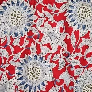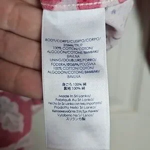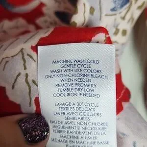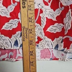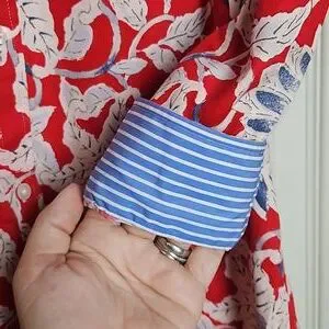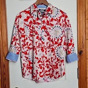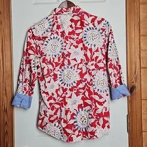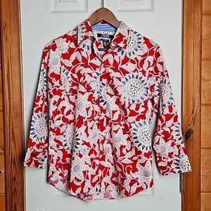Chaps womens no iron button down shirt. Size medium. Red, blue, & white floral pattetn. The sleeves are 3/4 & have blue & white stripes on the inside of the cuffs. The front measures 25.5" from the collar to the bottom. The back measures 26.5". Shoulder seam to shoulder seam is 15". Sleeves are 18.5" uncuffed. Measurments are approximate. Shirt is 100% cotton. Excellent condition