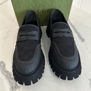 Maxi Penny Slot in GG Canvas embossed logo on the side round toe branded leather insole thick rubber lug sole slip-on style