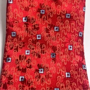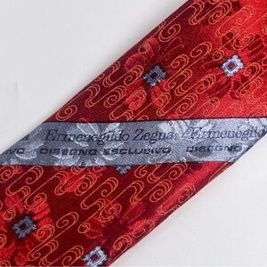 Ermenegildo Zegna Men’s Silk Neck Tie. Red with light blue squares, orange swirls and embossed flowers. 100% silk. Disegno Esclusivo. Made in Italy. In excellent used condition. About 3.5” at the widest part. About 60” long.