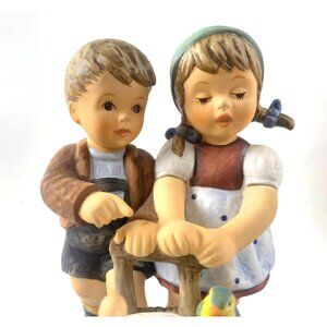This charming Hummel Goebel figurine captures the innocence and joy of childhood, depicting a brother and sister pushing a baby in a stroller. A delightful piece for collectors of vintage porcelain, it embodies the timeless artistry and attention to detail that Goebel is renowned for.