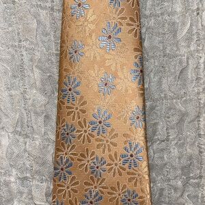 This tie is in very good condition, made of 100% polyester and is a yellowish orange color with pale blue and taupe flowers.