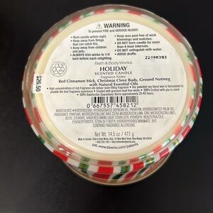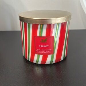 NWT Bath & Body Works HOLIDAY Scent 3 wick candle. Fragrance Notes: Red Cinnamon Stick, Christmas Clove Buds, Ground Nutmeg with Essential Oils. If you love the smell of cinnamon like I do, you have to get this one! It smells so good! The outside of the candle is festive too!
