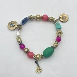 This bracelet features an array of vibrant beads complemented by gold-toned accents and unique charms, adding a touch of elegance to any outfit.