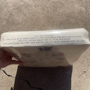 Brand new sealed in the original packaging. JCPenney percale sheets set. Four piece set includes flat sheet, fitted sheet and two pillowcases. Blue and pink roses and stems. Probably from the 90s. Made in the USA.