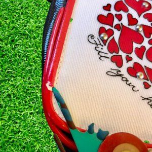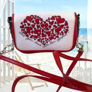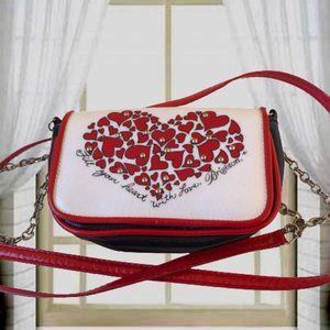 Brighton three color handbag for little girls. Magnetic flap closure. Hearts and silvertone studs on the front and wording - FILL YOUR HEART WITH LOVE, BRIGHTON