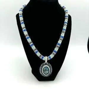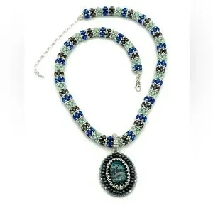 The pendant is a dyed agate stone in blues and black swirls and surrounded by silver and black seed beads, small shiny black beads and light blue glass crystals around the edge.