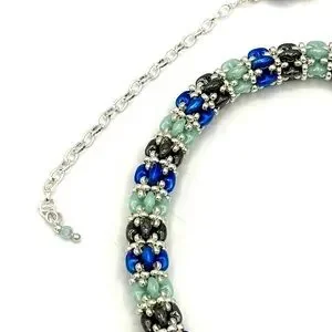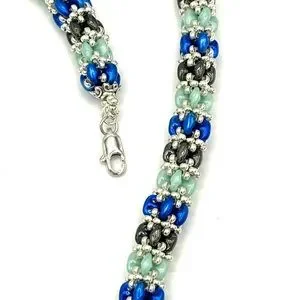 Special handmade statement necklace with a rope style necklace with black, aqua and royal blue metallic duo beads and silver seed beads.