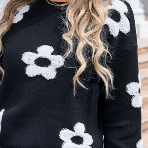 Contrasting Daisy Raised Retro Flower Pullover Top Long Sleeve Knit Sweater Shirt