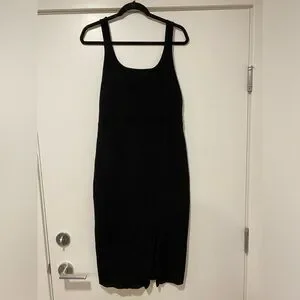 Babaton Bandage Dress in black, features square neckline and slit on left side. Details seen better in second and third photo.