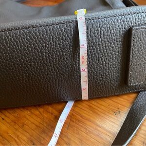 Top handle and shoulder strap are adjustable. Exterior pocket on front and side. Calfskin leather. Zip closure, interior pocket, lined.