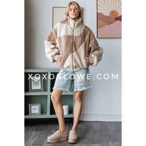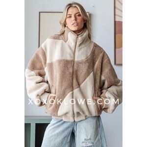 Oli & Hali Two Tone Zip Front Plush Cozy Sherpa Jacket in Mocha Cream Latte