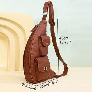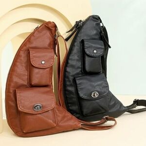 Large capacity minimalist retro chest bag, waist bag, crossbody bag, sling bag. Ideal for hiking and outdoor activities. Perfect for travel to keep wallet, ID, driver’s license, passport, credit cards, cash, traveler’s checks, etc. close to your chest if front worn. Simple design makes it a great bag for men. High-quality, vegan/faux black leather is pliable, lightweight, soft & supple, feeling great against the body. Silver hardware. Multiple pockets/zippered compartments comparable to Free People bags. Adjustable strap. Measurements in photo.