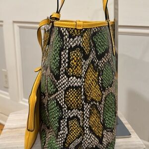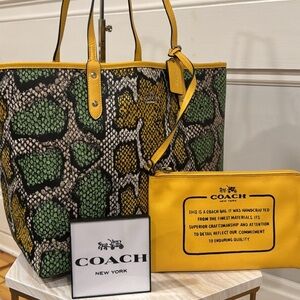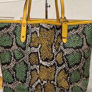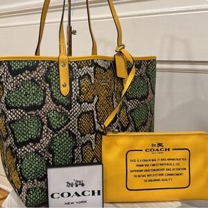 Rare! Coach City Bag in colourful Python Print - Excellent used condition with minor scuffing on wristlet that can likely be cleaned away. 3 bags in one: Wear it as a yellow bag or the python print or just carry the yellow wristlet. The cute detachable wristlet and key tag are included. 18x12x6 with 10” strap drop.