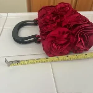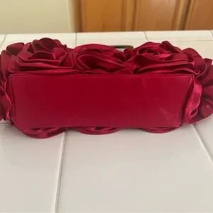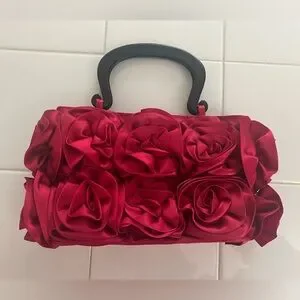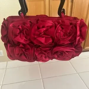 Add to a touch of elegance to your party or cocktail outfit with this Mad by Design Red Silk Roses appliqué Handbag. This gorgeous bag is so unique, you will be the talk of the party! Just perfect for the fashion-forward woman and just in time for the approaching holidays!!