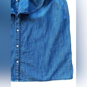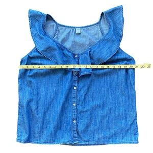 Old Navy women’s denim sleeveless top features a v-neck, ruffle neckline, and a button front. It is in good pre-owned condition.