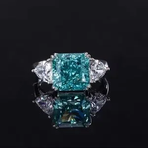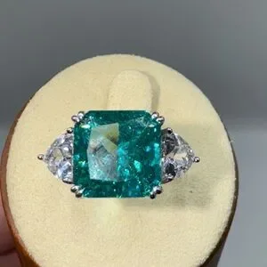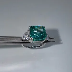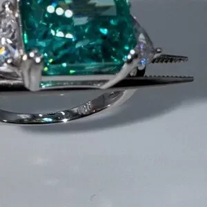 Set with a 5ct.tw. radiant cut teal tourmaline gem secured in a double 4 prong setting & accented with 2 0.50ct.tw. side diamond stimulant trillion cut stones