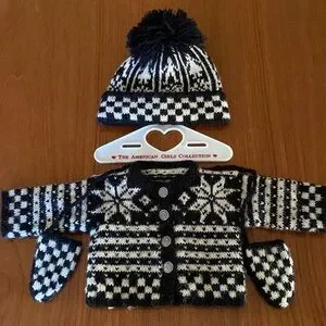 Vintage Pleasant Company American Girl Kirsten’s Winter woolen black/white knit traditional Scandinavian sweater with black ribbed cuffs/neckline, 4 silver buttons (missing last one), large stylized snowflakes on front/back. Knit hat with black pompom, black/white mittens attached to sweater by yarn & AG hanger complete the set. Excellent vintage condition. Please see all pictures.