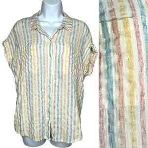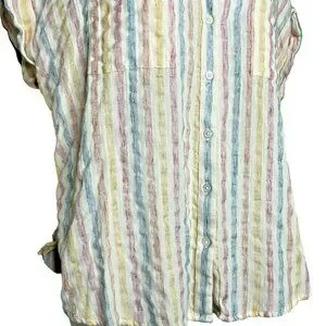 Lucky Brand Women's Size Large, Pastel Stripe Tie Wrap Back Short Sleeve Top Blouse. Multicolor Striped design made from 51% Cotton 25% Rayon 21% Polyester 3% Linen for a comfortable fit.