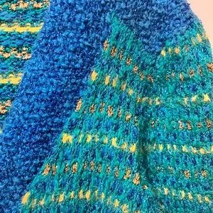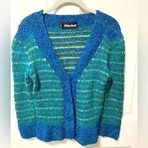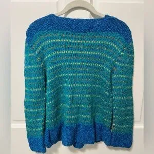 Fabulous unique Laines Anny Blatt yarn hand knit cardigan sweater in blue/green with metallic