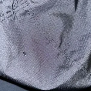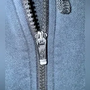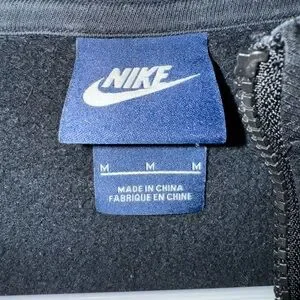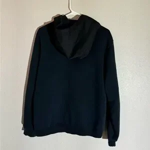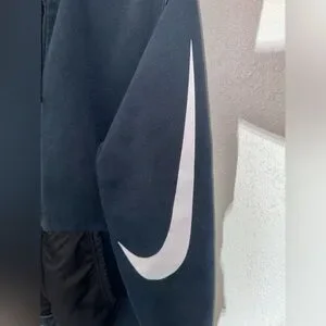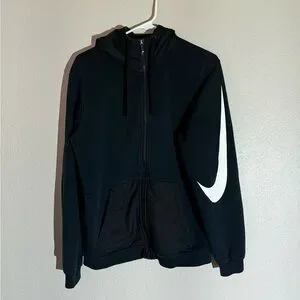 This is a black Nike zip up hoodie. The hood and pockets have a different material than the fabric, as shown in the photos. There is a small burn hole from a campfire on the back of the hood as shown. NON SMOKING HOME. Any questions please ask!